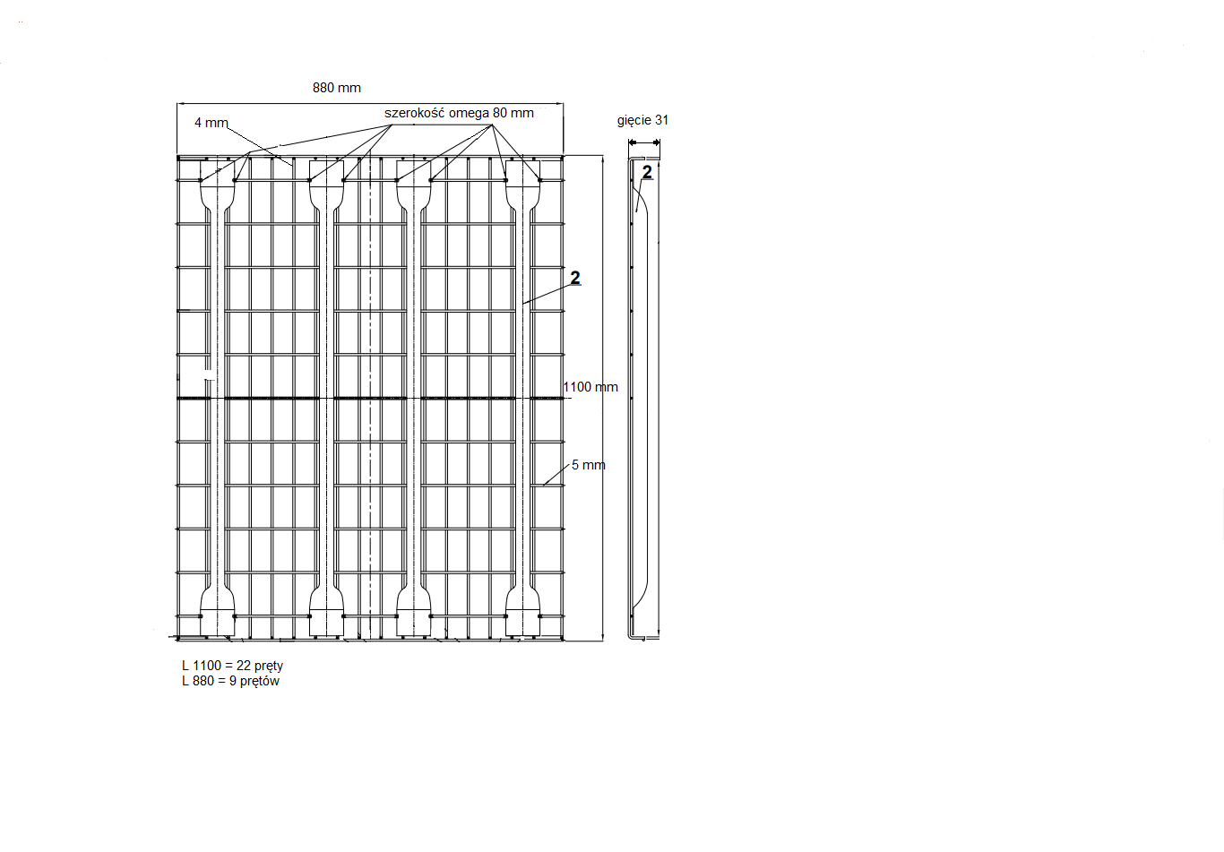 Wykonana z siatki zgrzewanej opartej na 4 kształtownikach stalowych [omegach]